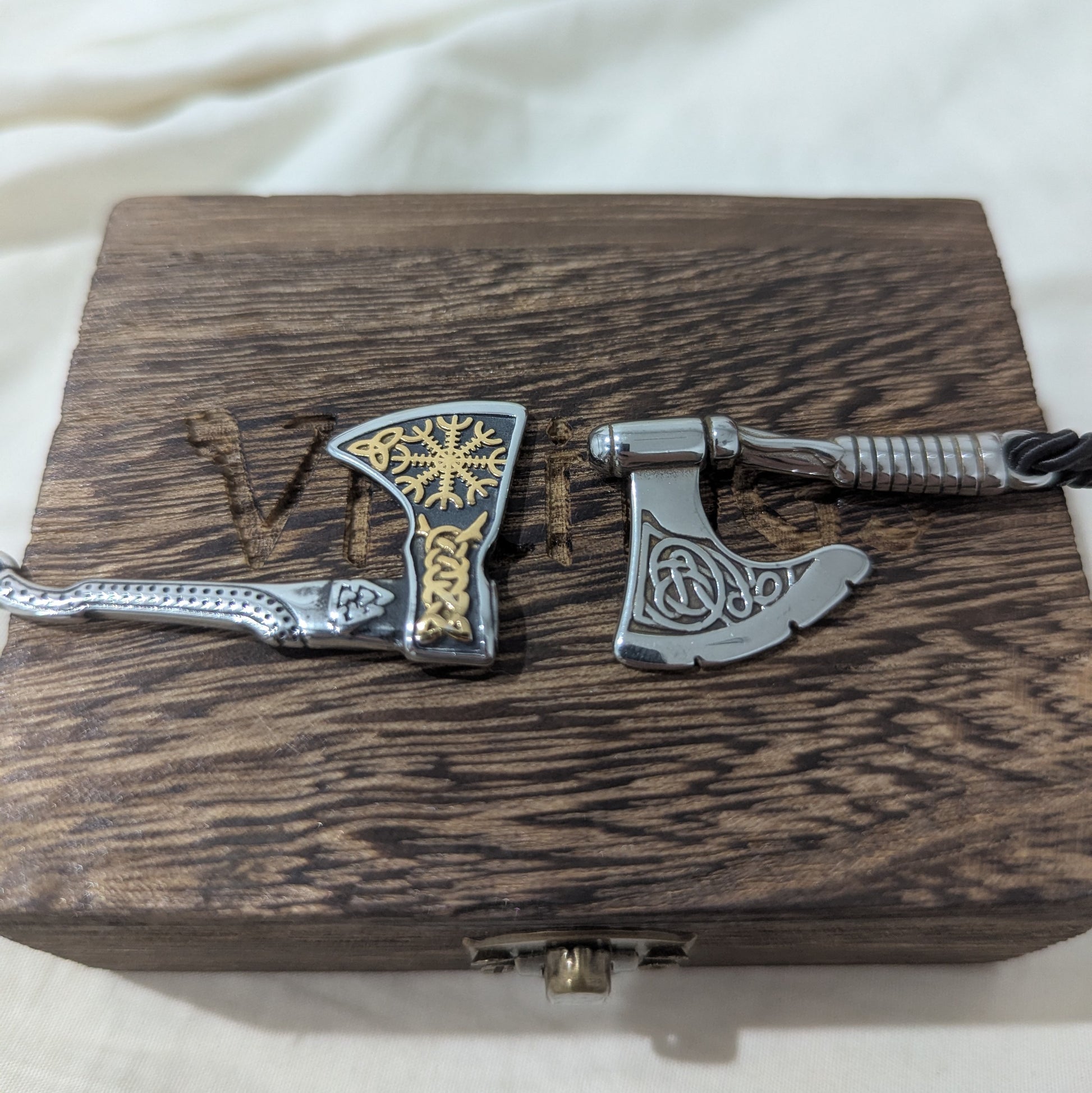 - Durable stainless steel axe heads with detailed engravings